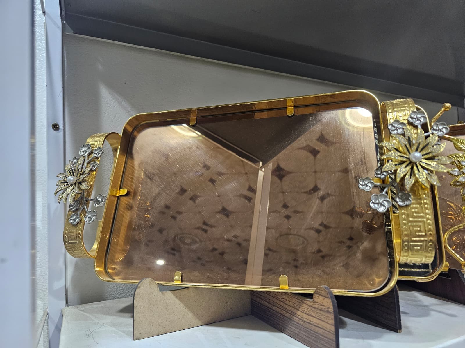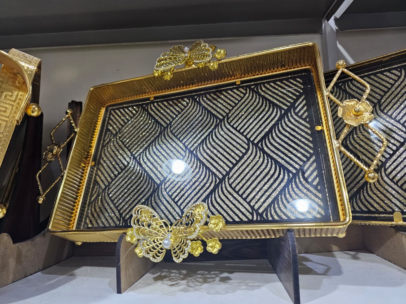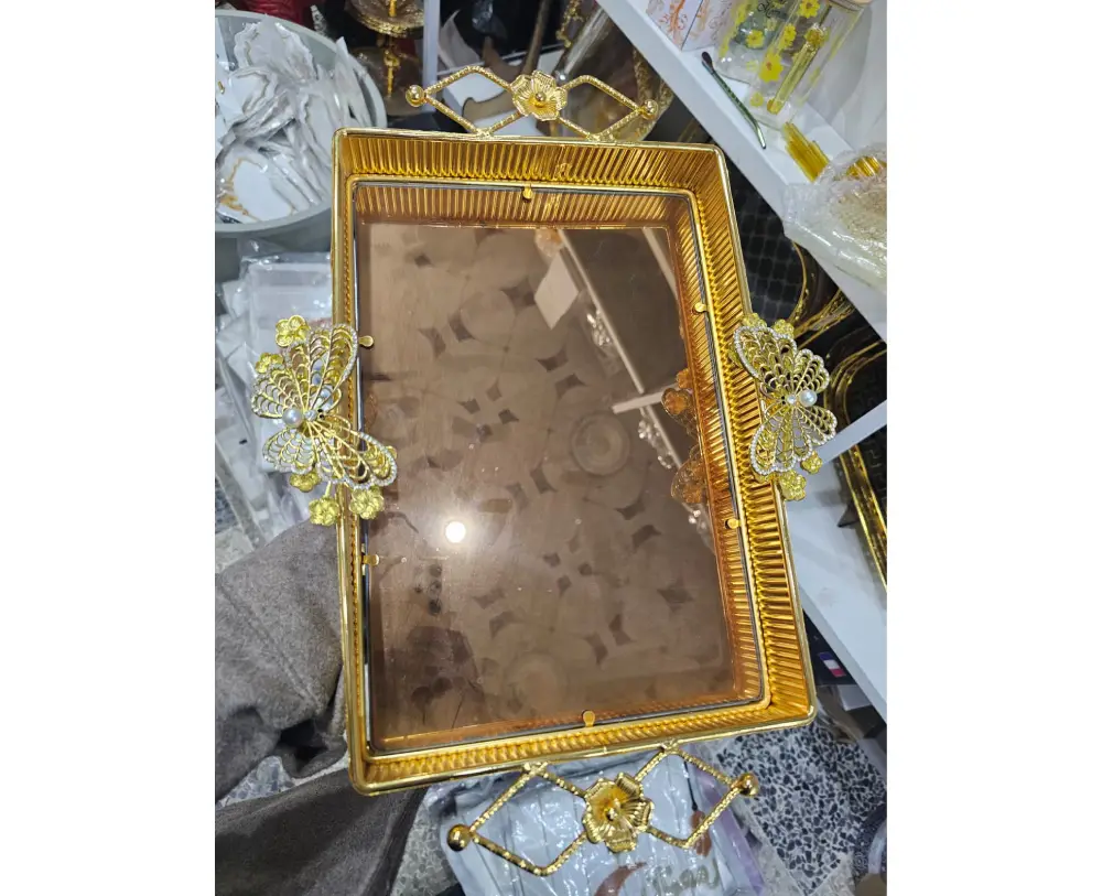 صينية مفردة بأشكال مختلفة بسطح بلوري وزخرفة ذهبية أنيقة