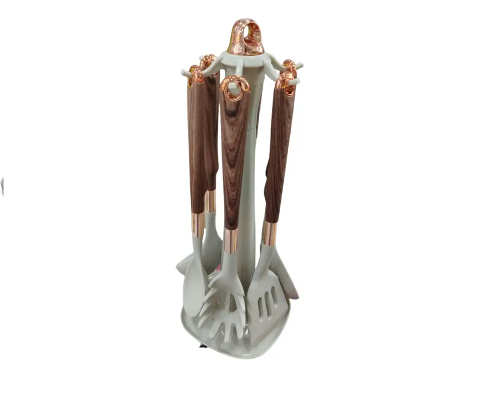 طقم أدوات مطبخ من السيليكون يحوي 6 قطع بمقابض خشبية أنيقة، مقاوم للحرارة، آمن للأواني وخاصة الغرانيت، مع ستاند عملي للتنظيم