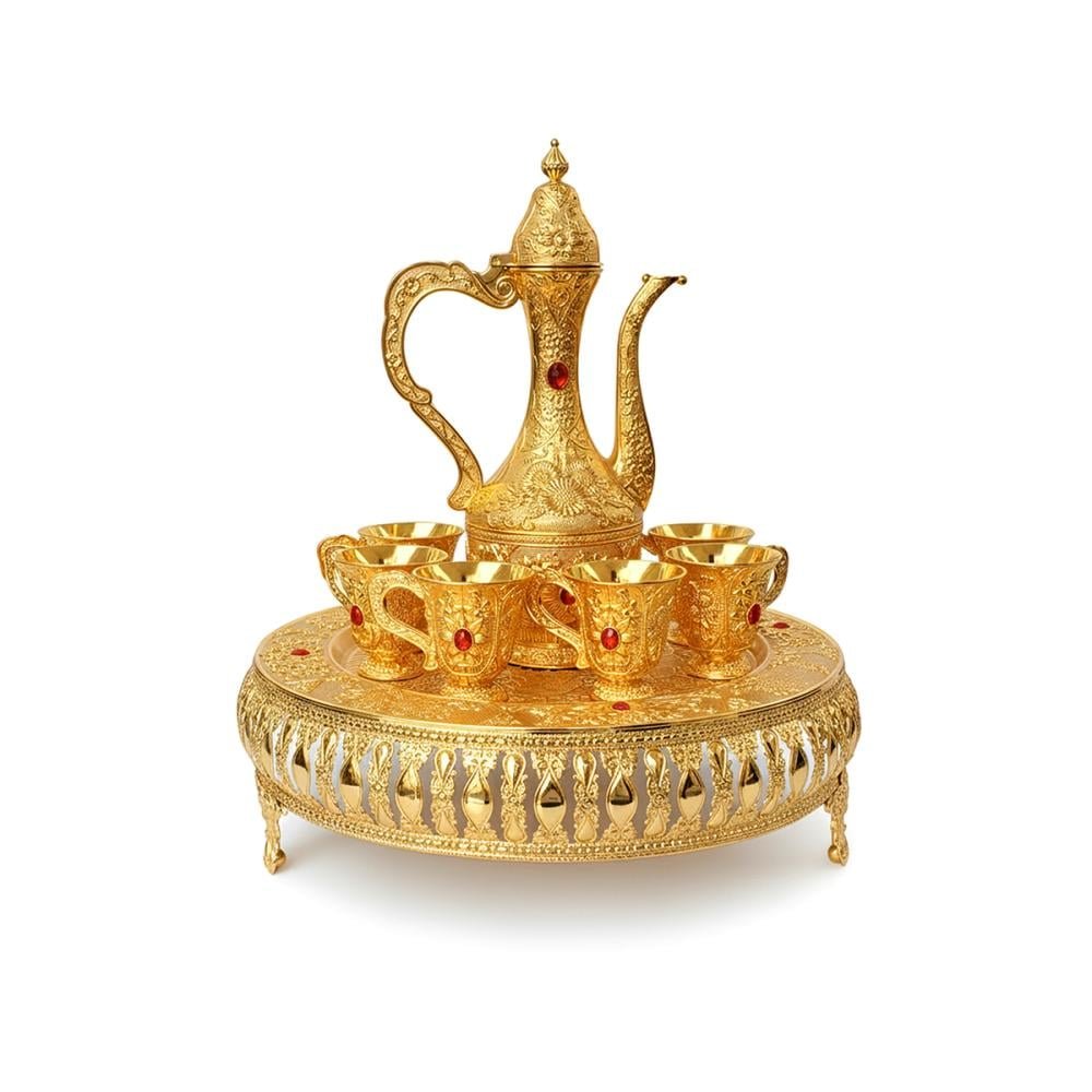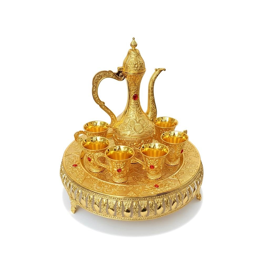 طقم تقديم مياه زمزم والقهوة والشاي فاخر مطلي باللون الذهبي مع دلة و 6 فناجين وصينية تقديم مزخرفة، مثالي للضيافة والمناسبات الراقية