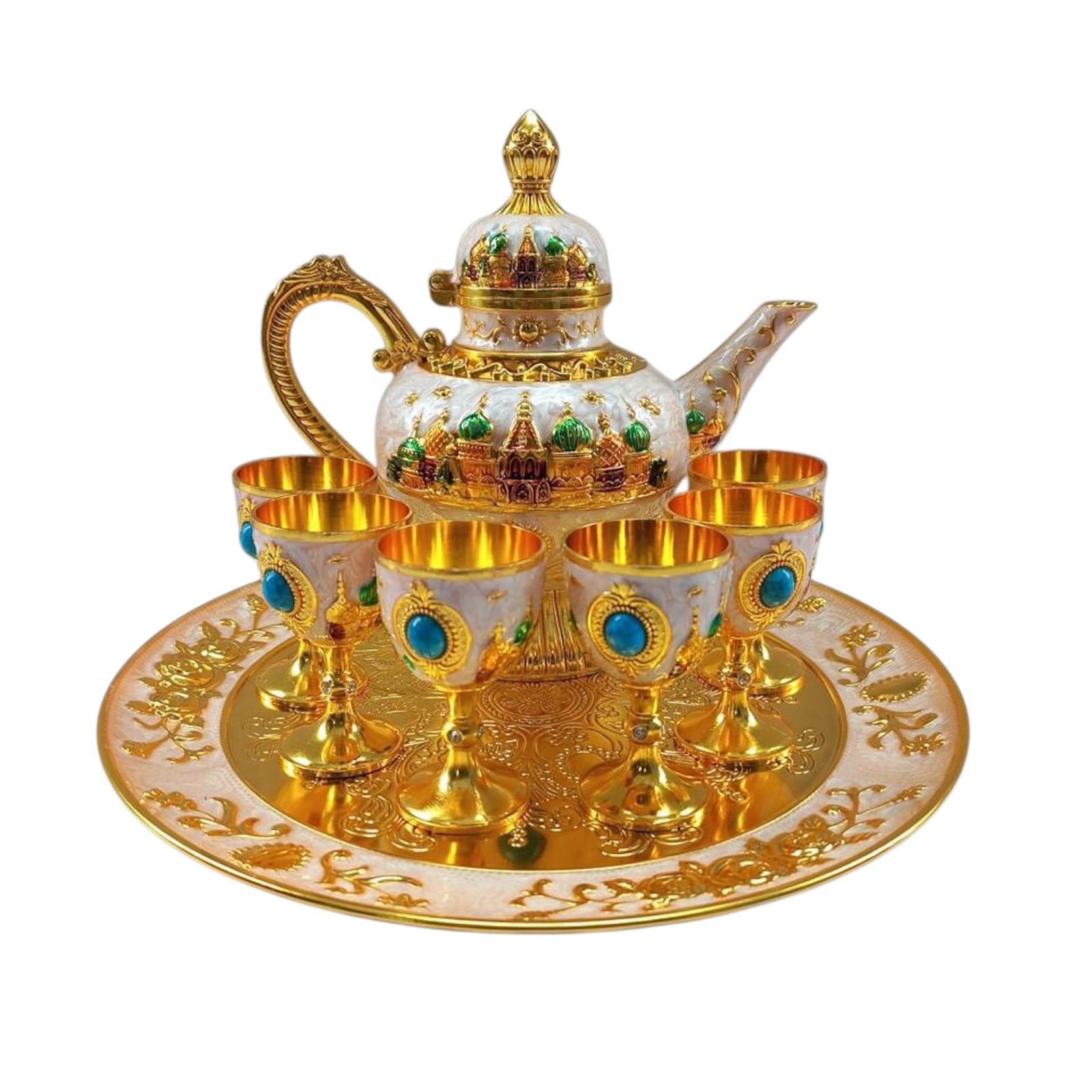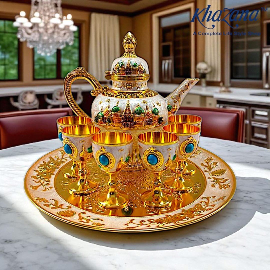 طقم تقديم مياه زمزم وشاي مع دلة و6 كاسات مع صينية مزحرفة