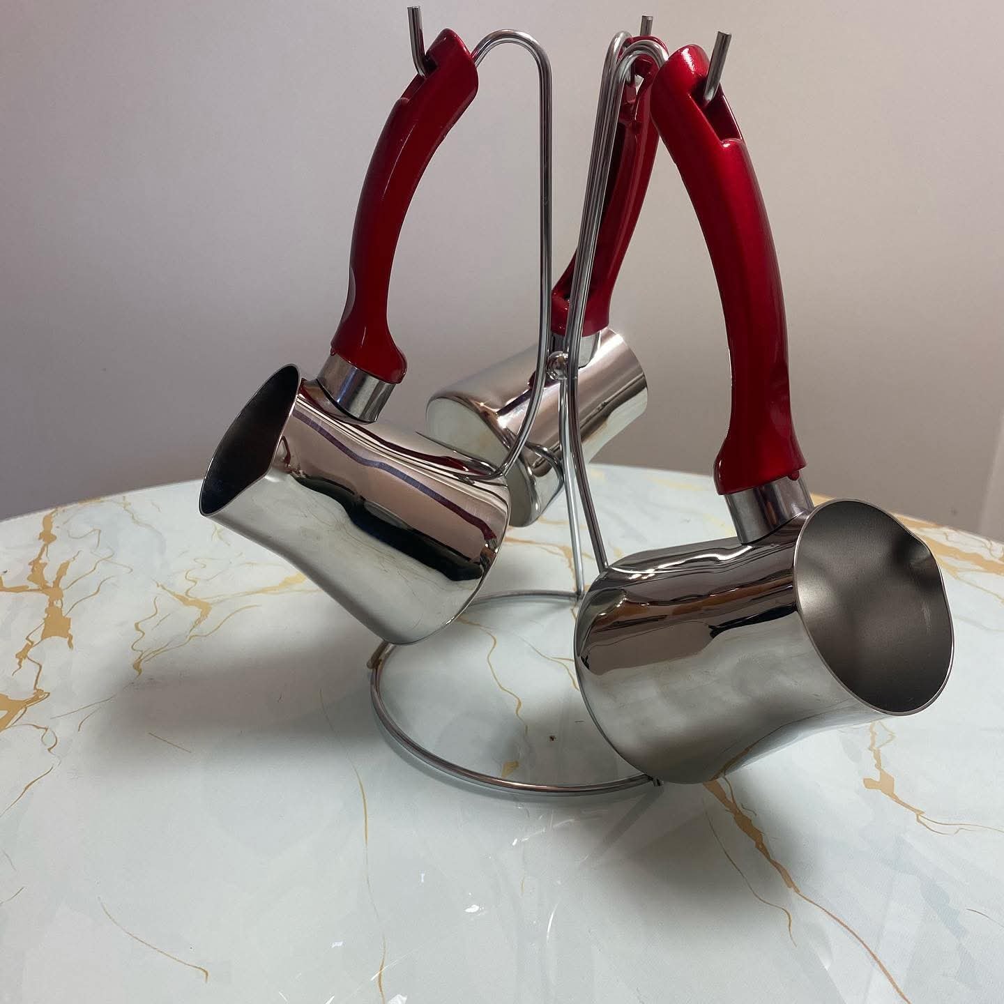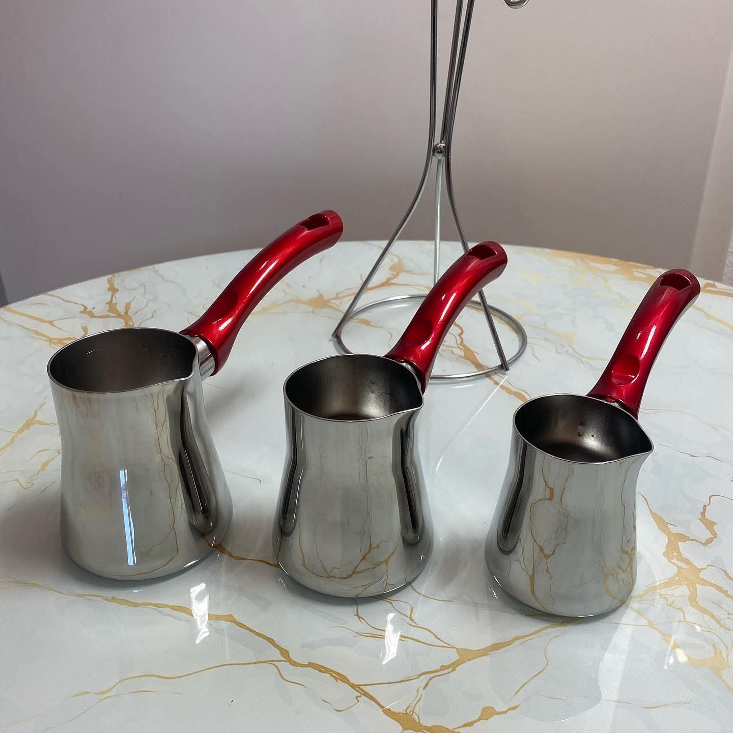 طقم ركاوي قهوة ثلاثي حجم كبير مختلفة القياسات من ستانلس ستيل عالي الجودة بمقابض مقاومة للحرارة مع ستاند حامل لها