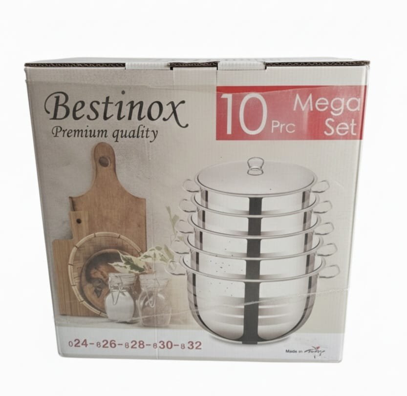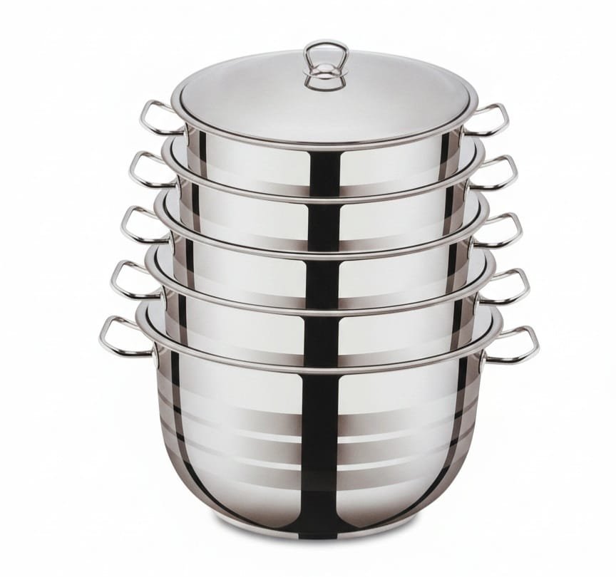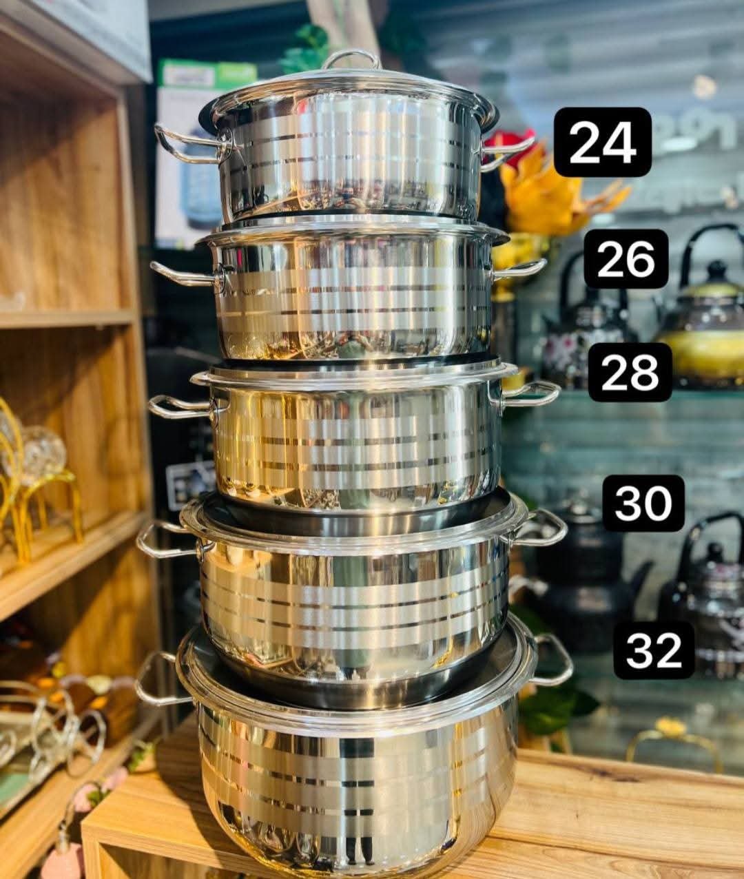 طقم طناجر تركي فاخر بمقاسات متنوعة (24، 26، 28، 30، 32 سم)، مصنوع من الستانلس ستيل عالي الجودة بتصميم متين يناسب كافة احتياجات المطبخ. ويعمل على الغاز و الليزرية