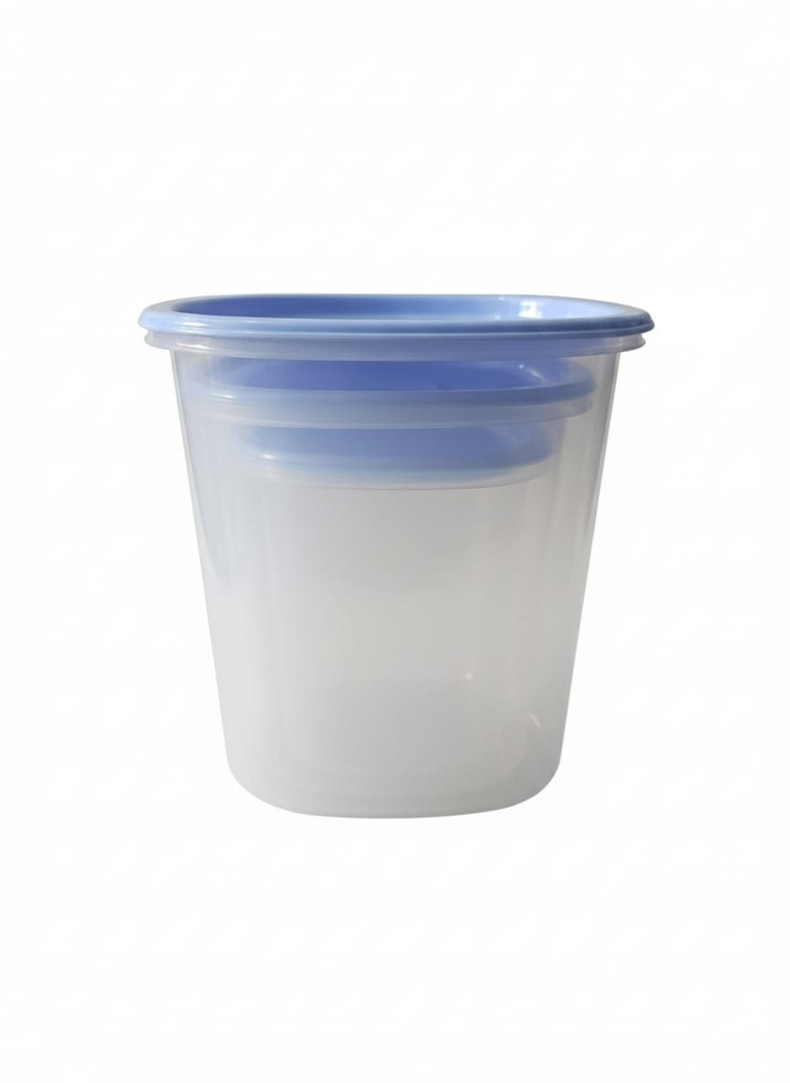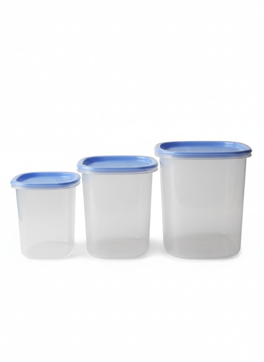 طقم علب تخزين بلاستيك شفاف مكون من 3 قطع بأحجام متدرجة وأغطية زرقاء محكمة الإغلاق، مثالي لتنظيم المطبخ وحفظ الطعام طازجاً.