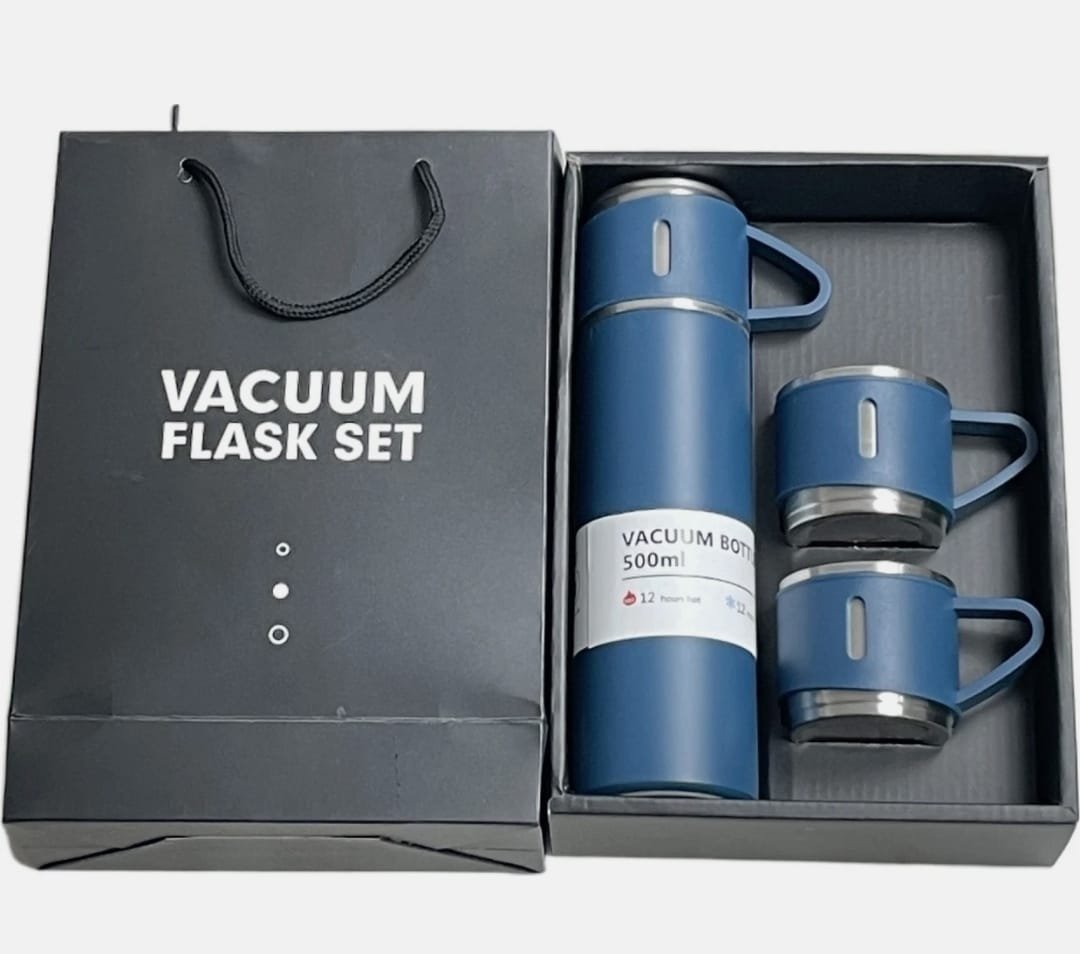 طقم مج فاخر يتكون من مطرة حرارية سعة 500 مل باللون الازرق الداكن تحفظ الحرارة والبرودة من 6 إلى 8 ساعات، مع كوبين إضافيين بتصميم أنيق، مصنوع من الفولاذ المقاوم للصدأ ويأتي مع علبة وحقيبة إهداء