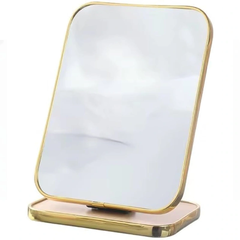 مرآة مكتبية أنيقة بتصميم عصري، إطار معدني باللون الذهبي، شكل مستطيل بحواف ناعمة، قاعدة ثابتة مانعة للانزلاق، زاوية ميل قابلة للتعديل، مناسبة للمكياج والعناية اليومية، خفيفة الوزن وسهلة النقل، مثالية لغرف النوم وطاولات التزيين والمكاتب.
