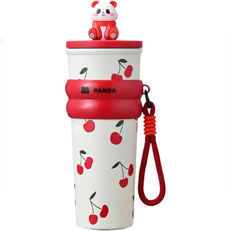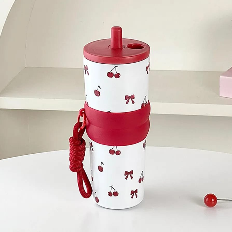 مطرة حافظة حرارة بنقشة الكرز، 710 مل يحافظ على المشروبات ساخنة وباردة، غطاء محكم مع فتحة شرب ، خفيف وسهل التنظيف، مناسب للاستخدام اليومي والتنقل.