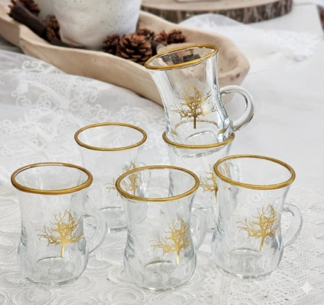 طقم كاسات شاي زجاجي فاخر مكون من 6 كاسات ، يتميز بتصميم تركي أنيق بحواف مذهبة ونقوش ذهبية راقية للأشجار، مزود بمقابض مريحة لتقديم الضيافة بلمسة عصرية جذابة تناسب جميع مناسباتك.